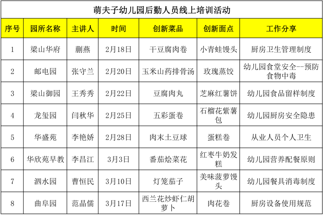 本次学习活动采用各幼儿园后厨人员与后勤主任进行周期性工作分享的形式开展,内容包括创新菜品、创新面点以及后厨工作管理经验分享。每次活动开始之前,需要检查上一期活动内容记录的完成情况,保证每一名后厨人员都能充分融入到活动中来。